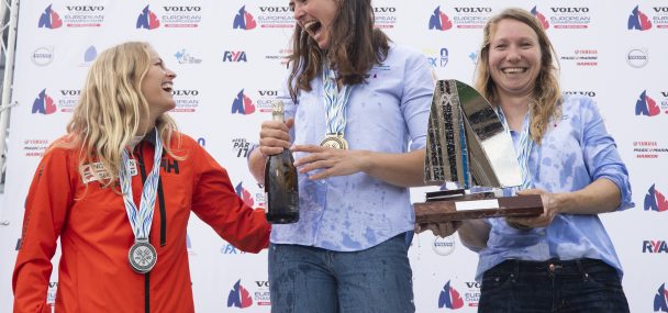 The Dutch won the pin end of the line and cruised off towards the left-hand side in the soft, 6 knot breezes. They reached the windward mark in first place and looked set for a straightforward win until they were beaten to the final windward mark by the Norwegian crew, Helene Næss and Marie Rønningen. The Norwegians held the lead on the last downwind leg and crossed the finish line ahead, sufficient to give the 2018 European Champions the bronze medal. The Dutch held their nerve to cross the line in second place, making them the European Champions (excluding the Brazilians) and earning them a place at next year’s Olympic Games in Tokyo. Grinning from ear to ear, Bekkering and Duetz hugged each other in relief at their double victory.