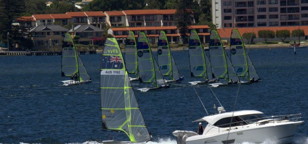 Sixteen boats competed in the event, eight 49ers and eight FX. The fleet was a mix of local teams, eastern state teams, one New Zealand team and two Singaporean teams. The fleet had only days earlier competed in the Australian Championships off Fremantle in often very windy conditions. The flat water of the Swan River was a welcome relief for all sailors. At the start of the regatta the fleet was again greeted by strong seabreezes. It was a very different race course compared to the Australian titles with much more passing lanes. During racing it was always possible to attack the boat in front while still being mindful of protecting the boat behind. This made the 20 minute courses very tactical with tight racing in both fleets.